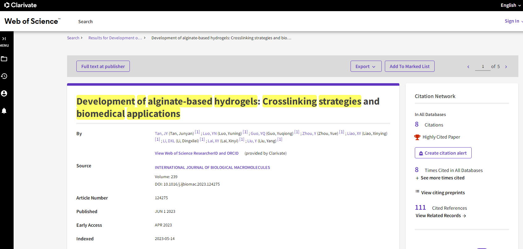 论文2“Development of alginate-based hydrogels: Crosslinking strategies and biomedical applications”正式发表于2023年6月,目前被引用次数8次。该论文全面介绍了制备海藻酸水凝胶的各种交联策略,综述了其在药物载体、伤口敷料和组织工程领域的代表性应用进展,讨论了海藻酸水凝胶的应用前景、挑战和发展趋势,为其进一步发展提供了指导和参考。