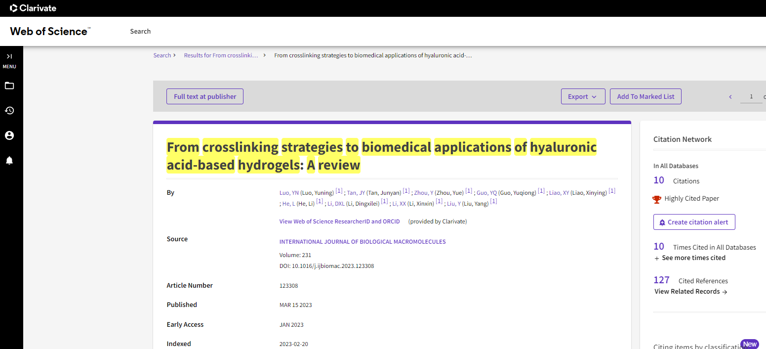 论文1“From crosslinking strategies to biomedical applications of hyaluronic acid-based hydrogels: A review”正式发表于2023年3月,目前被引用次数10次。该论文介绍了透明质酸水凝胶独特的交联策略和制备方法,并重点介绍了其在抗癌药物传递、软骨修复、三维细胞培养和皮肤敷料等领域的应用,为该类凝胶的设计及其在生物医学领域中的深入应用奠定了基础。