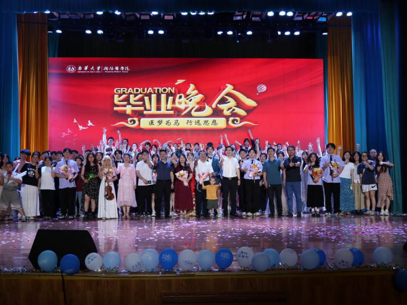 太阳成集团tyc33455cc2025届毕业生文艺晚会在全场齐唱的南华校歌中圆满落幕,在场领导老师和工作人员上台合影留念,至此,整场晚会圆满结束。