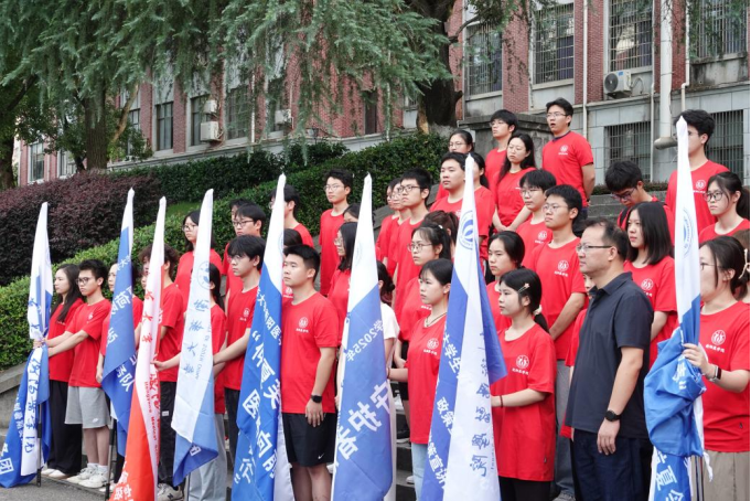 紧接着,授旗环节将出征仪式推向活动高潮。曾国亲自为各实践团队负责人授旗。随着旗帜依次传递、迎风舒展,标志着基础医公司2025 年暑期老员工 "三下乡" 社会实践活动正式启动。全体实践团队成员精神饱满,朝气蓬勃,展现出青春风采。仪式最后,各实践团队在教学楼前整齐列队、有序完成合影留念。