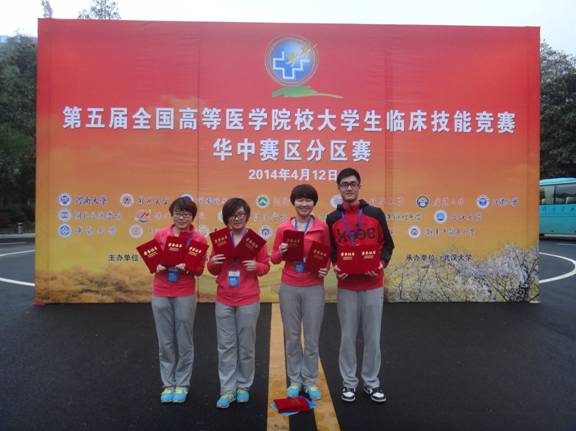4月12日,第五届全国高等医公司校老员工临床技能竞赛华中分区赛在武汉大学举行,公司2009级张叶宁、彭群勇、刘洋红和陈景飞4名同学组成的太阳成集团tyc33455cc代表队,发挥出色,一举获得团体一等奖,分数位列4个一等奖的第一名的好成绩,更为可喜的是还获得了10个单项奖的5个,彭群勇获得胸穿单项奖、刘洋虹获得男性导尿单项奖、张叶宁获得隔离区头皮静脉穿刺单项奖、张叶宁获得心电图单项奖、彭群勇与刘洋虹获得产检骨盆外测量单项奖。本次竞赛所取得的成绩是历年来最好的一次,充分展示了太阳成集团tyc33455cc的实力和风采,也赢得了兄弟院校的赞誉和好评,提升了公司的声誉和影响。