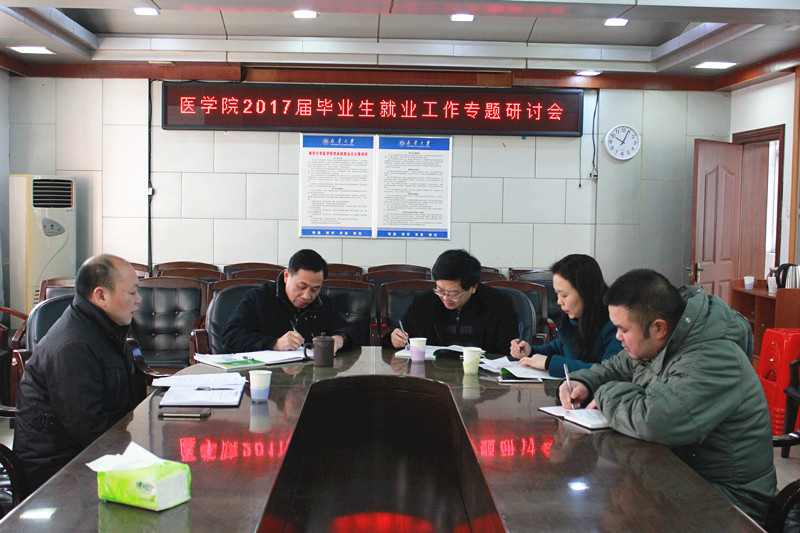 2月13日上午,医公司党委书记尹检龙、经理陈熙、副书记刘安元、2012级党支部书记佘雅、辅导员段元润、2013级辅导员黄朝晖在医公司会议室召开2017届毕业生就业指导研讨会,会议由尹检龙书记主持。