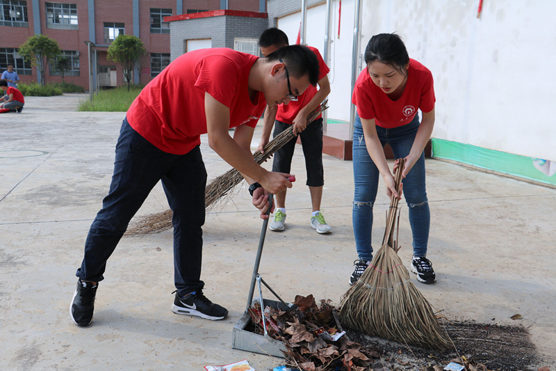 当天,志愿者前往当地的阳坳小学,在公司操场、升旗台、教学楼等地开展大扫除活动。骄阳似火,志愿者们发扬不怕苦、不怕累的精神,经过3个多小时的劳动,整个公司焕然一新,为即将开学的孩子们营造了一个整洁干净的校园环境。