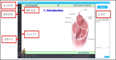 组织学与胚胎学是一门重要的医学基础课,属于形态学范畴,其线上教学受到了多方面因素的制约。例如在开课初期教师们先后尝试了“超星直播”和“雨课堂”等多个平台,但是发现员工无法看到老师鼠标所指的结构,不利于员工学习和掌握形态结构。经过多方面对比,教师们发现“腾讯课堂”和QQ屏幕分享的直播,可以弥补这一缺陷,于是使用腾讯课堂(极速版)进行直播授课。腾讯课堂授课可以充分发挥四个方面的功能:一是PPT授课功能;二是视频播放功能;三是屏幕共享功能;四是在讨论中输入文字与员工交流功能(图1)。此外,还可以音频开关按钮向员工播放教学音频。