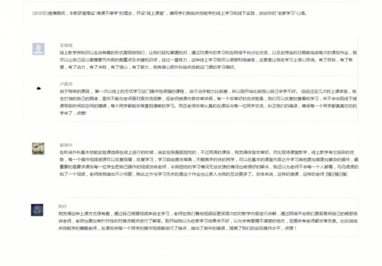 四项探索与尝试初见成效,参与线上教学的2018级临床医学专业的员工认为主要有两个方面感受比较深刻:一是疫情期间,老师们依旧能够将学科知识点十分详尽地教授给我们,保证了线上的学习效率,更难能可贵的是,每次我都在课后休息期间问了一些整理课件时发现的问题,老师们都没有丝毫推脱,利用他们的休息时间给我讲解;二是此次线上教学安排十分尊重员工的选择,每次网课开始前,老师们都会问我们对于上次的网课有什么要改进的地方,将建议收集后,老师们也会很快做出改进,保证了每一次网课的教学质量。