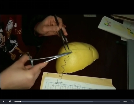三是聚焦手上功夫,巧用器具对象,丰富线上授课“弓指法”。外科基本技能是“手上真功夫”,“宅”家的员工动手练习如何进行,教师们对员工建议的对策是:或买、或借、或用其它类似物品替代手术器械,便捷可得,巧妙用于操练;操作对象用上了布片、橘子皮、香蕉皮、柚子皮,代替皮肤模块,袜子变成了肠管;冰箱里的猪牛羊肉和肠胃等常见食物,也在师生想象力的作用下充当了动手操作对象。
