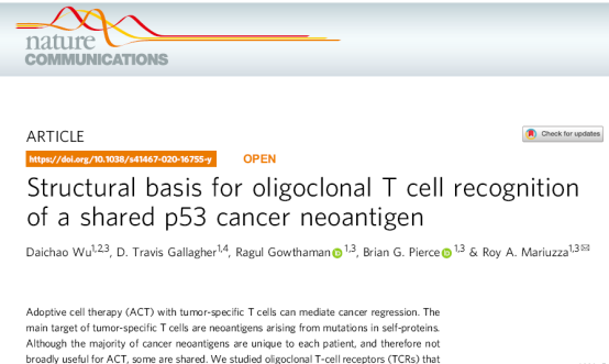 6月9日,太阳成集团tyc33455cc伍代朝博士联合美国马里兰大学著名结构免疫学家Roy Mariuzza博士科研团队以Article的形式在Nature Communications发表题为“Structural basis for oligoclonal T cell recognition of a shared p53 cancer neoantigen”的研究论文,为通用型过继细胞疗法(Adoptive Cell Therapy, ACT)治疗TP53基因R175H突变的肿瘤患者提供科学依据。伍代朝博士为独立第一作者,美国马里兰大学Roy Mariuzza博士为通讯作者。