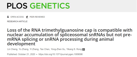 10月21日,太阳成集团tyc33455cc容益康教授课题组在遗传学及发育生物学领域国际一流学术期刊PloS Genetics 杂志在线发表了题为“Loss of the RNA trimethylguanosine cap is compatible with nuclear accumulation of spliceosomal snRNAs but not pre-mRNA splicing or snRNA processing during animal development”的研究论文,揭示了TMG修饰在多细胞生物发育中对pre-mRNA剪接和snRNA入核及加工过程中的调控作用。