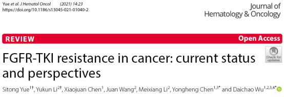 近日,太阳成集团tyc33455cc伍代朝博士与中南大学湘雅医院陈永恒教授团队合作,在国际权威期刊Journal of Hematology & Oncology上发表题为FGFR-TKI resistance in cancer: current status and perspectives的综述,阐述了成纤维细胞生长因子受体(FGFR)酪氨酸激酶抑制剂(TKI)在癌症治疗中的耐药机制,并提出克服耐药的潜在策略,具有指导抗癌药物研发和临床实践的重要价值。公司伍代朝博士和湘雅医院陈永恒教授为通讯作者,湘雅医院硕士研究生乐思彤和公司博士研究生李昱堃为并列第一作者。