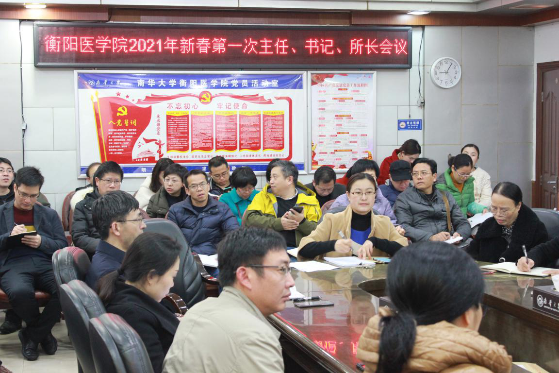 会上,陈端阳首先代表公司领导班子,向全体参会人员和全院职工拜年,接着,公司各分管领导对本学期近段时间的工作和2021年重点工作进行了安排和布置,并提出了工作要求。桂庆军副经理首先汇报了新学期的人员到岗情况,对2021年的人才引进工作进行了布置,要求院属各科室在该项工作中,要做到早、细、实,尽早解决在人才引进中,有临床医学背景的人员不足的现状;高层次人才的实验室的装修、机能中心等房屋改造搬迁工作,要求及时跟进。何战胜副书记强调了员工开学疫情防控工作,请各位班主任、专业老师以三全育人为主线,做好员工教育管理工作。李忠玉副院对即将上传的国家自然基金及其他各级各类课题的申报工作,再次强调了注意时间节点,安排了公司对国家自然基金课题标书的集体评审。曾国副经理向大家介绍了公司在对各附属医院的考核工作及公司与长沙相关医院的合作进展。唐志晗副经理对开学前的教学准备工作进行了部署,同时请大家按照教学课题的申报指南,早做准备。各教研室要在教学、科研上加强基础与临床的融合;尽早准备新一轮的教学建设项目申报工作。2月26日,全国研究生考试分数线刚公布,祖旭宇副经理希望今年的研究生招生中,能再接再厉保持一本招生率,继续提升研究生的生源质量;提出,今年学位点建设仍然是一项工作重点,包括临床专业学位博士点申报和特种医学硕士点恢复工作。