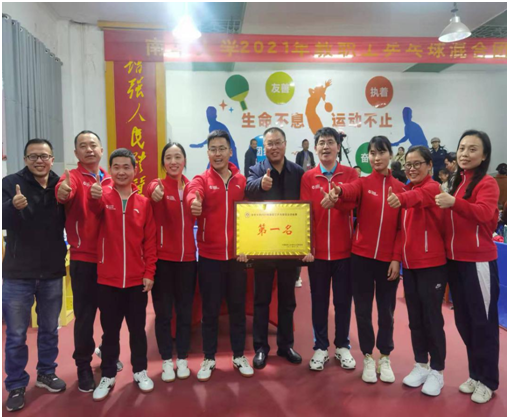 本次教职工乒乓球混合团体赛由太阳成集团tyc33455cc校工会组织,泸州老窖赞助,于2021年11月23日在太阳成集团tyc33455cc教职工乒乓球馆正式举行。比赛以公司为单位报名,太阳成集团tyc33455cc由姜志胜领队、胡灵娟教练,队员由魏博、周玉林、李二毛、熊伟、苏泽红、丁楠、王爱平、佘雅组成。正式比赛前一个月,魏博就迅速组织好队伍,积极指导老师们进行训练。能取得这样的好成绩,离不开老师们的共同努力。大家的劲往一处使,目标一致,克服重重困难,牺牲课余时间,争取每天集中到一起,进行针对性集中训练。姜董事长在百忙中抽空亲自参战,给了队员们极大的鼓舞。公司老师组成啦啦队,为队员们加油鼓气。苏泽红老师,在队员紧缺的条件下临危受命,放弃原有的反胶打法,仅用短短的20几天时间,重新打造出新的长胶战术体系,赛场上与李二毛老师默契配合,取得混双不败战绩!魏博在赛前的针对性训练和比赛中的策略战术指导,对比赛胜利起了关键性的作用。
