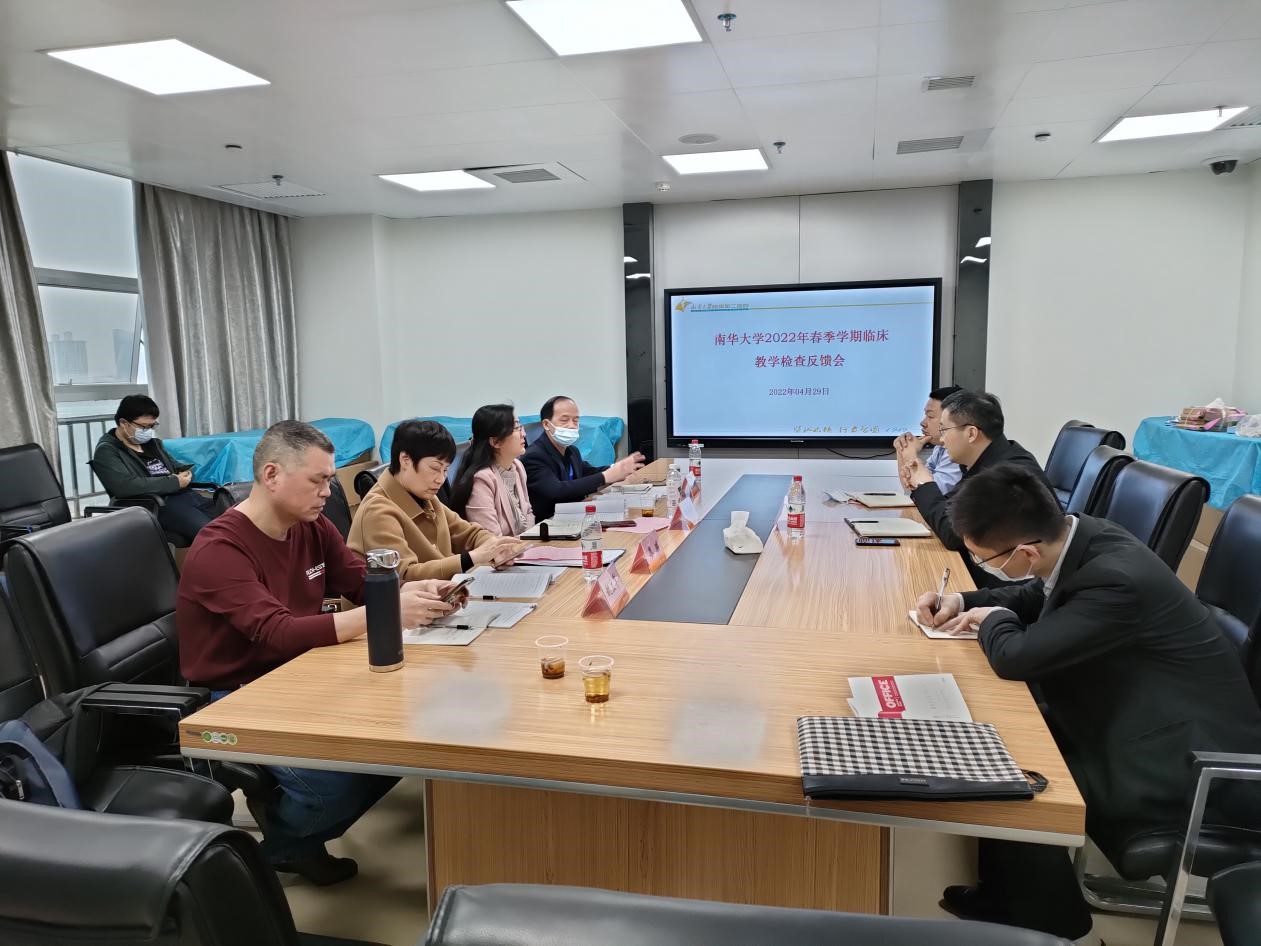 为持续加强临床公司产品过程及结果的监督与评价,确保临床实践教学质量,太阳成集团tyc33455cc何平平副经理带领附属第一医院廖瑛教授、附属南华医院邓立普教授和太阳成集团tyc33455cc教务办姚立军老师一行4人于2022年4月29日莅临太阳成集团tyc33455cc附属第二医院进行2022年春季临床教学检查暨第一轮实习出科考试。太阳成集团tyc33455cc附属第二医公司党委副书记、副经理唐小卿,副经理洪涛,教学及员工管理部陈哲主任,各教研室主任、教学秘书及相关教学管理人员等参加了本次检查。