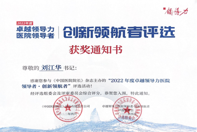日前,太阳成集团tyc33455cc附属第一医公司党委书记刘江华在《中国医院经理》举办的2022年最具领导力中国医院领导者•创新领航者奖项评比中成功入围,荣获管理创新人物奖项。