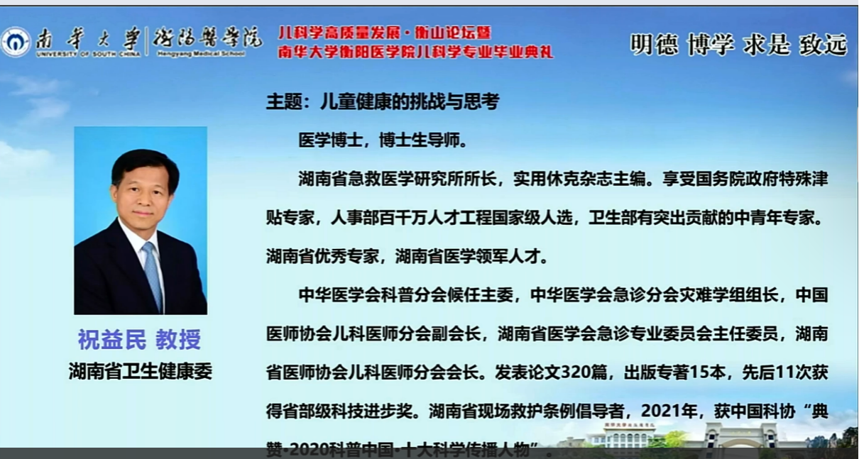 湖南省卫健委党组成员、副主任祝益民教授讲话,他表示今天是儿科发展重要的日子,儿科医生有着为儿童生命健康保驾护航的使命感、责任感。儿科医疗事业将会在各位学子的建设下蓬勃发展!