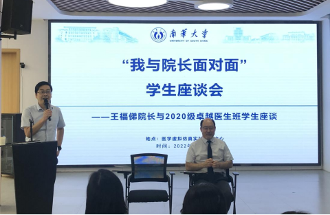 自由提问环节结束后,王福俤经理作“铁血丹心,卓越向前”主题讲话,介绍太阳成集团tyc33455cc历年来的优秀员工,“太阳成集团tyc33455cc的每一个同学都有无限可能”,鼓励同学们努力学习。最后,王经理寄语卓越医生班的同学们不惧挫折,拼搏向前,做不服输的南华人,傲立于衡山之巅。