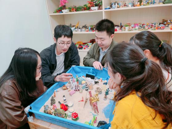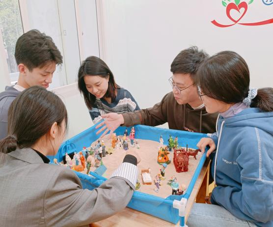 沙盘游戏是以荣格心理学原理为基础,由多拉·卡尔夫发展创立的表达性的心理疗愈技术。通过水、沙具、沙盘,来呈现其所感受和体验到的语言又无法做出清晰描述的内在世界。团体沙盘游戏是利用沙子和沙具进行意象创建的一种将情感体验“得之于心,应之于手,形之于沙”的心理干预方法,具有集积极性、互动性、包容性和趣味性为一体的操作优势。