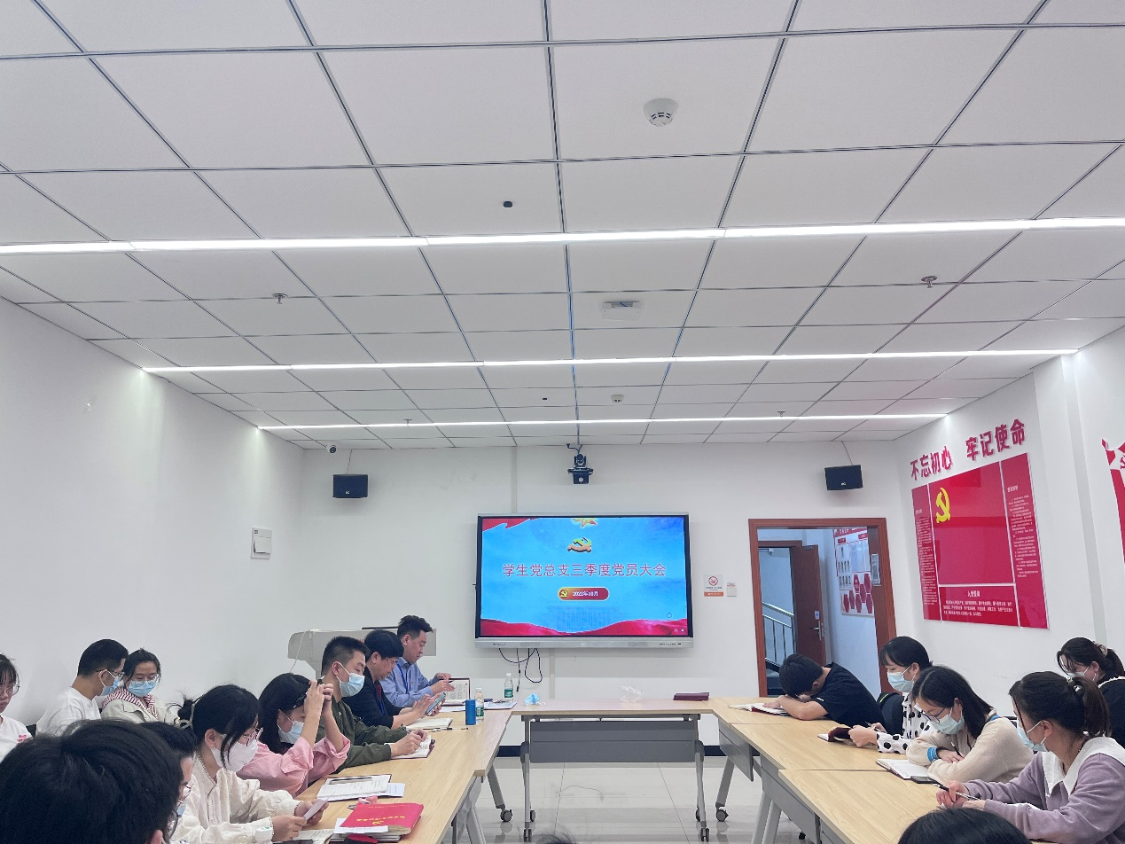 随后,总支书记朱晟同志从党的二十大报告表述的新论述新观点出发给研究生党员们上了党课,要求每一位党员要从“五个方面”牢牢把握党的二十大报告的精髓,坚持人民至上、生命至上,作为卫生事业工作者我们要尽最大努力保护人民生命安全和身体健康,把二十大报告的精神践行到我们的工作、学习和生活中来,多学多问,刻苦钻研,在医院高质量发展过程中,对标对表去实现国家对我们的要求,确保首次通过国家执业医师考试,树立阶段性目标并为之奋斗。同时要求研究生党员们要有国家总体安全观,落实到每一位党员上,就是从我做起,围绕医院的各项安全生产工作,确保宿舍消防安全、医疗安全、生物实验室安全、疫情防控安全等。