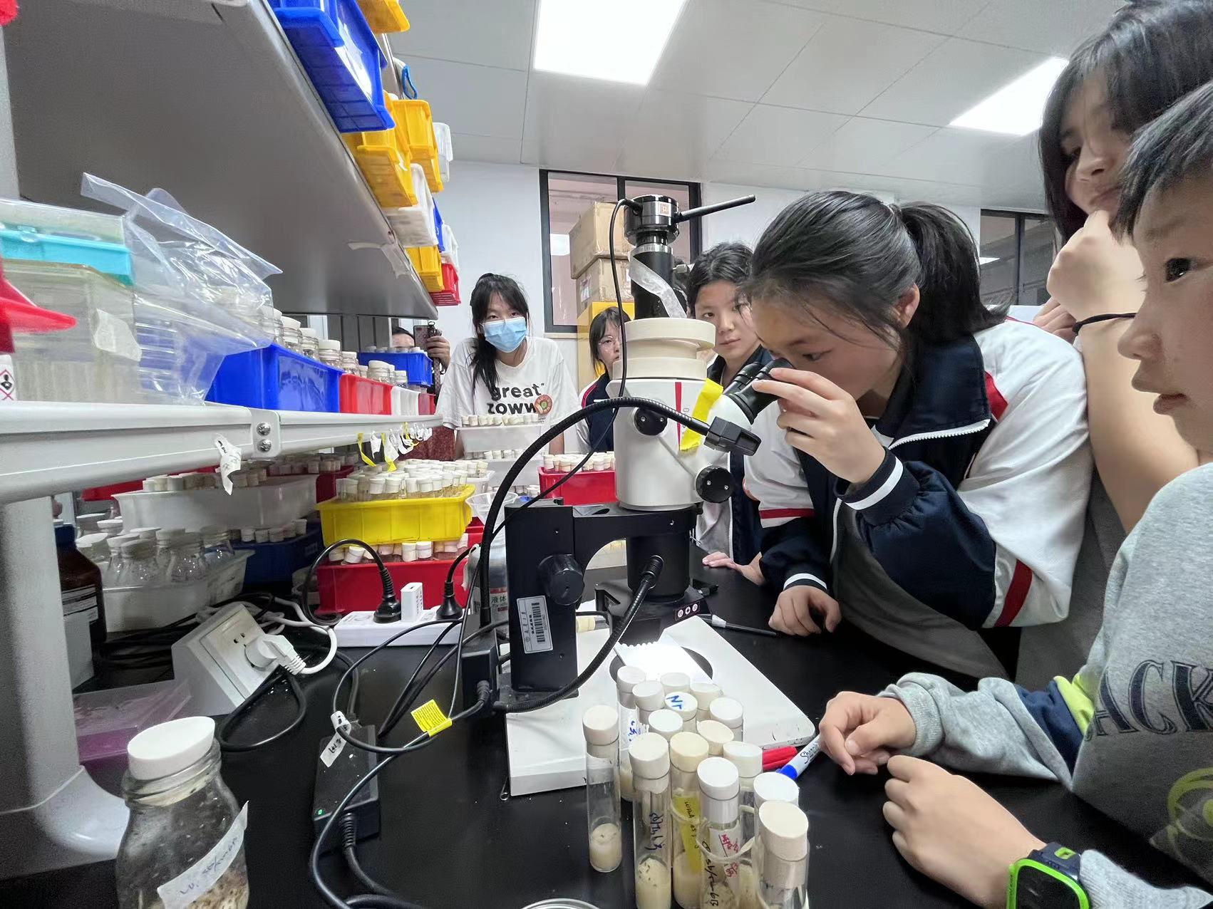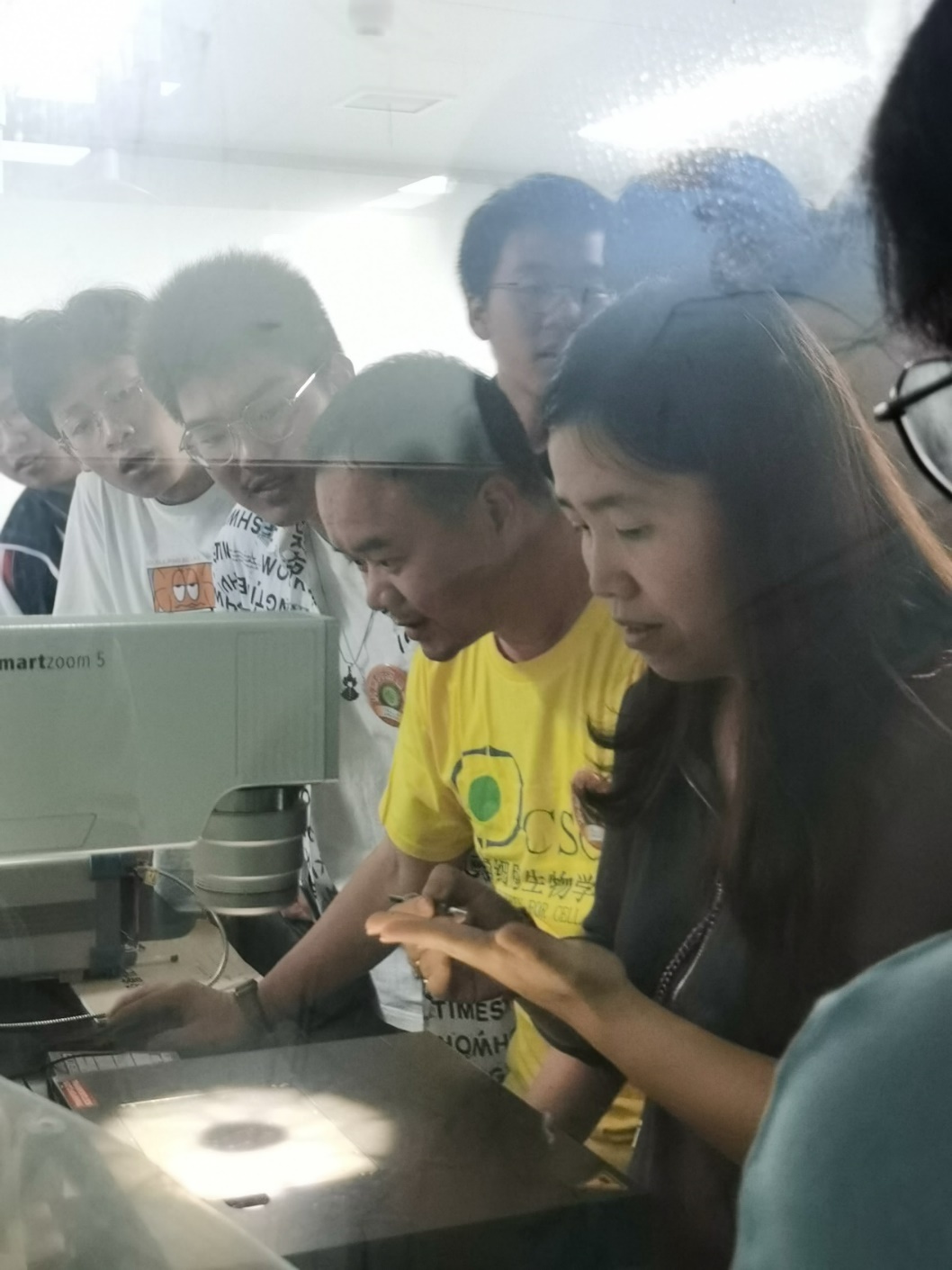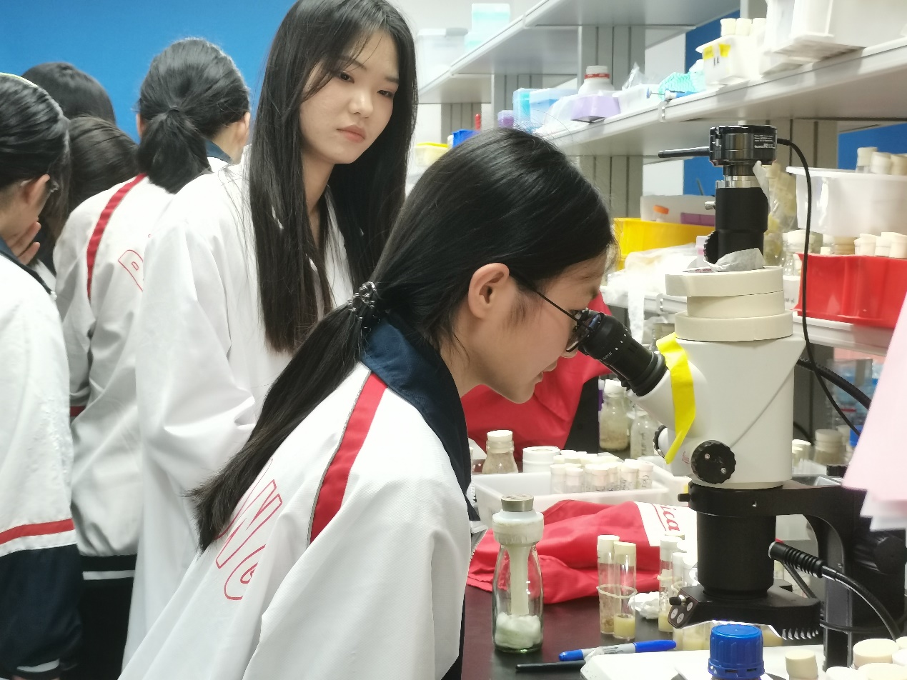 图6硕士生肖莹指导员工观察果蝇性状