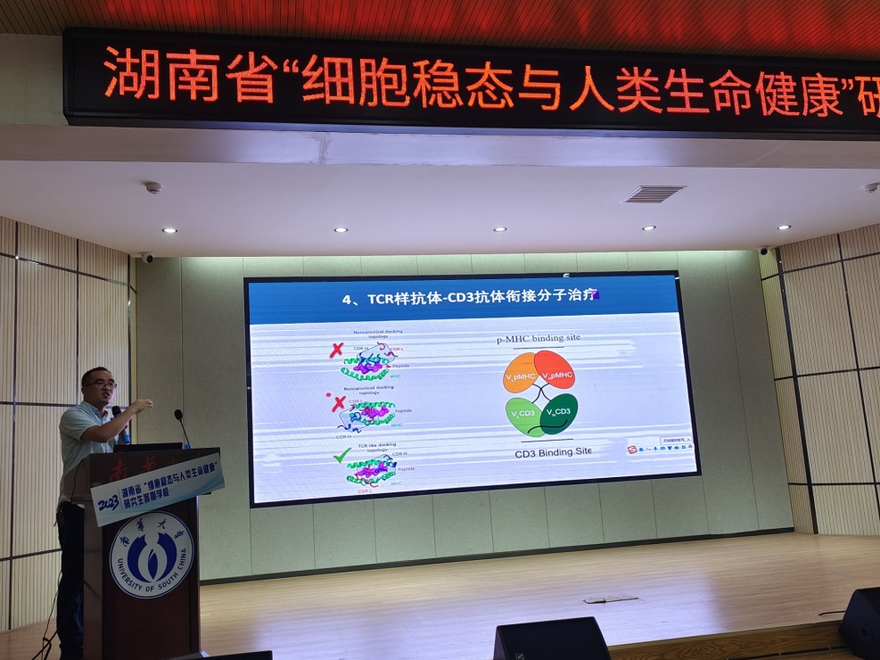伍代朝教授作“基于肿瘤新抗原的TCR治疗”学术报告。他的研究为通用型过继细胞疗法治疗TP53基因R175H突变的肿瘤患者提供科学依据。未来将专注于解析TCR识别肿瘤新抗原的结构、TCR-CD3抗体衔接分子、TCR样抗体衔接分子、TCR样抗体-CD3抗体的研究。以期为研发高效抗肿瘤的TCR-T细胞疗法提供了重要的数据支撑。也希望感兴趣的同学加入到基于肿瘤新抗原的TCR治疗的研究队伍中,研究更高效的肿瘤治疗方法。