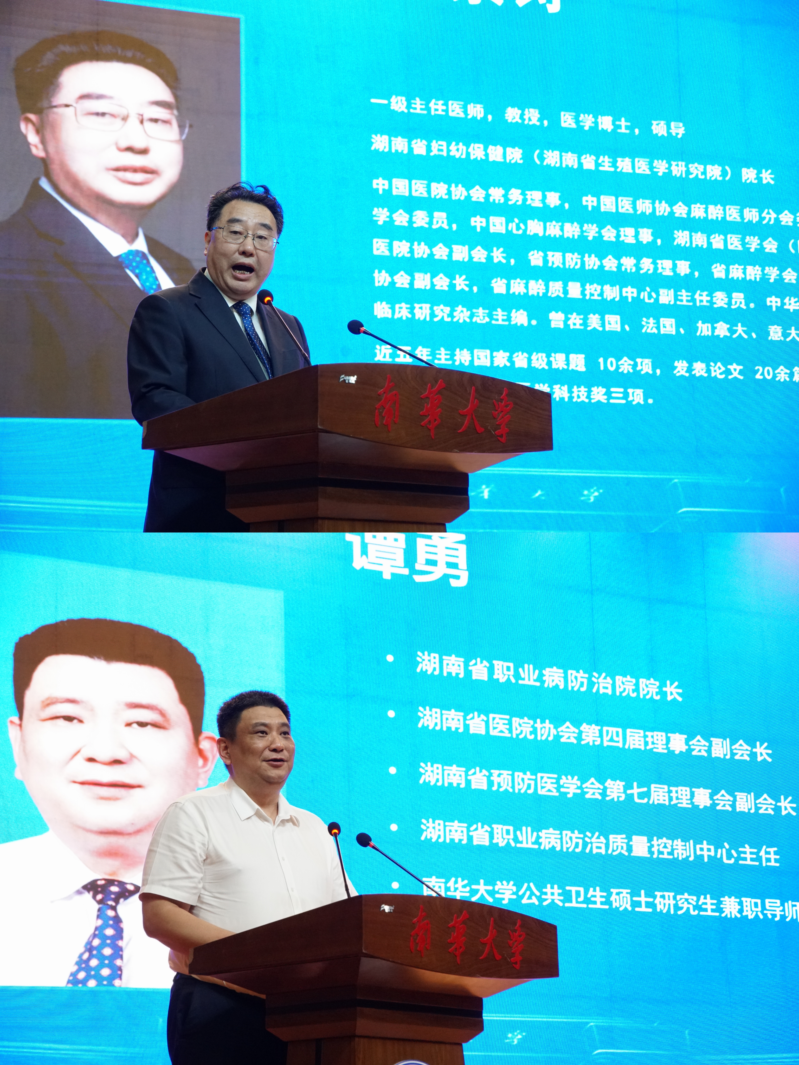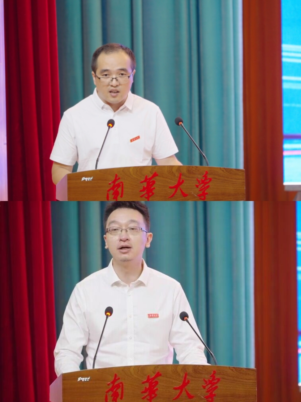接下来是公司教师代表发言,第一位发言的是湖南省杰青、湖湘英才获得者伍代朝教授,他向新生们提供了三点宝贵建议:一、在挫败中成长,不惧困难,勇战困难;二、敢于质疑权威与传统,善于发现前辈的局限,激发新思想;三、培养仁爱之心,为人民生命健康保驾护航。第二位发言的是湖南省教书育人楷模(提名奖)、全国工人先锋号获得者南华临床公司钟哲峰,他寄语广大衡医新生:“在学医这条路上,同学们务必铭记初心,从前辈身上汲取经验与力量。与此同时,恪守医道,坚持从医品格应是医务人员时刻放在心上的标尺,希望你们要分清有所为与有所不为。”