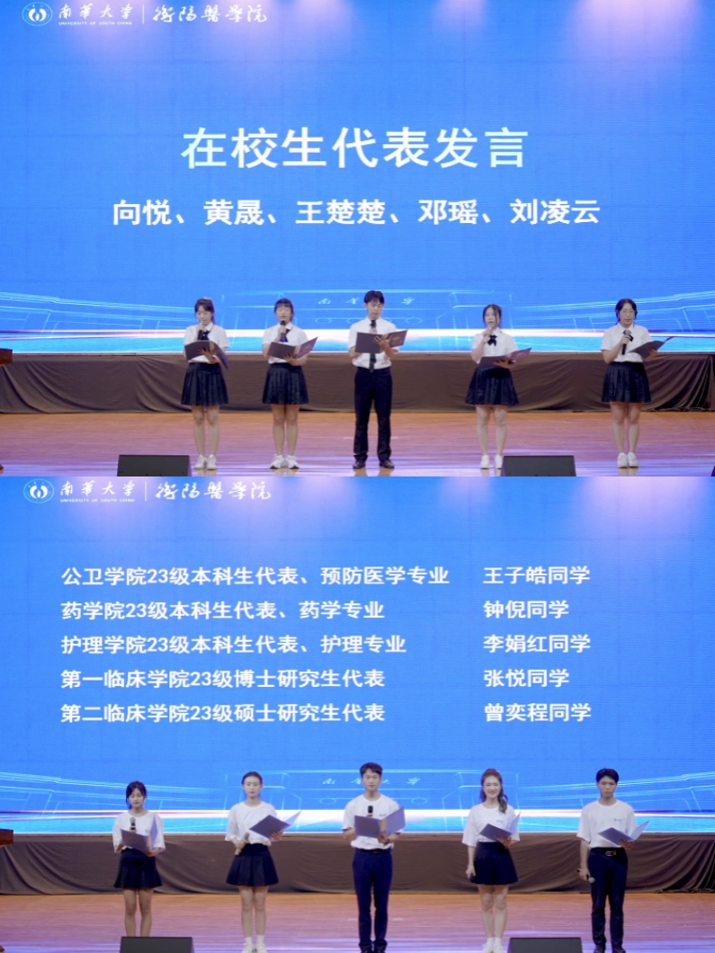 随后,5位在校生代表和5位新生代表分别上台齐声朗诵表达对公司公司和老员工活的热爱及期盼。在他们的诵词中,观众们真切感受到了在校生们“共筑衡医梦、共谱南华梦、共圆中国梦”的决心,也看到了新生们“胸有凌云志,无高不可攀”的信心。