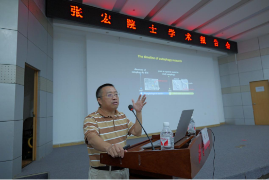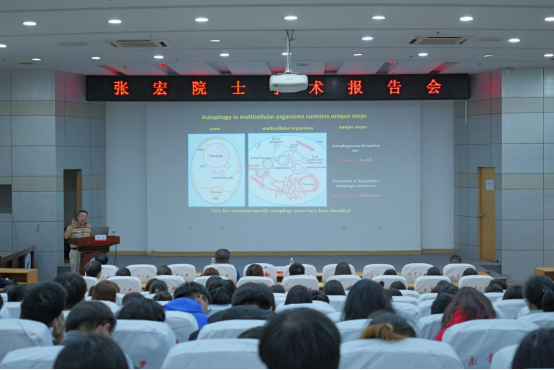 报告会上,张宏院士以“多细胞生物自噬起始的分子机制”为题,系统讲解了细胞自噬的概念、酵母自噬与多细胞生物自噬作用的异同,并介绍了其课题组在多细胞生物自噬研究领域所取得的最新进展。张宏课题组创立了秀丽线虫遗传筛选模型,鉴定了一系列多细胞生物特有的新自噬基因,并阐明了它们在多细胞生物自噬特有步骤中的作用机制,这极大推动了人们对多细胞生物中自噬过程的认识。