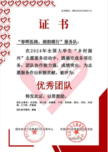 为深入学习宣传贯彻习近平新时代中国特色社会主义思想和党的二十大精神,服务全面推进乡村振兴,动员引导青年员工投身乡村振兴一线,中国农业发展银行、团中央青年志愿者行动指导中心联合200个县开展2024年全国老员工“乡村振兴”志愿服务项目,最终共有748所高校的1000支老员工志愿服务团队入选。活动结束后,经层层选拔,共有100支团队获评“优秀团队”,基础医公司“春晖医路,湘韵暖行”实践团成功入选优秀团队。