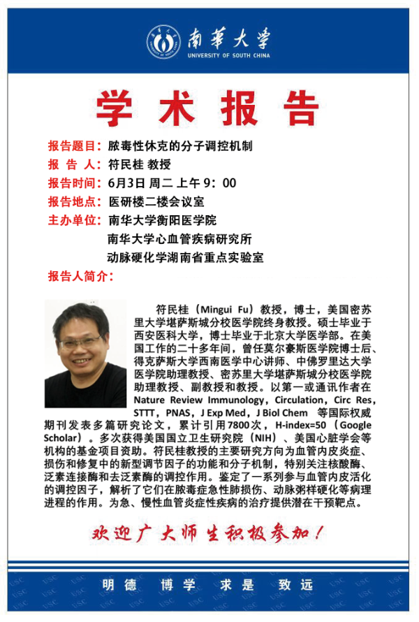 学术报告 | 符民桂教授:脓毒性休克的分子调控机制 & 李勇副研究员:TRIM65在围术期脏器损伤中的作用及机制研究