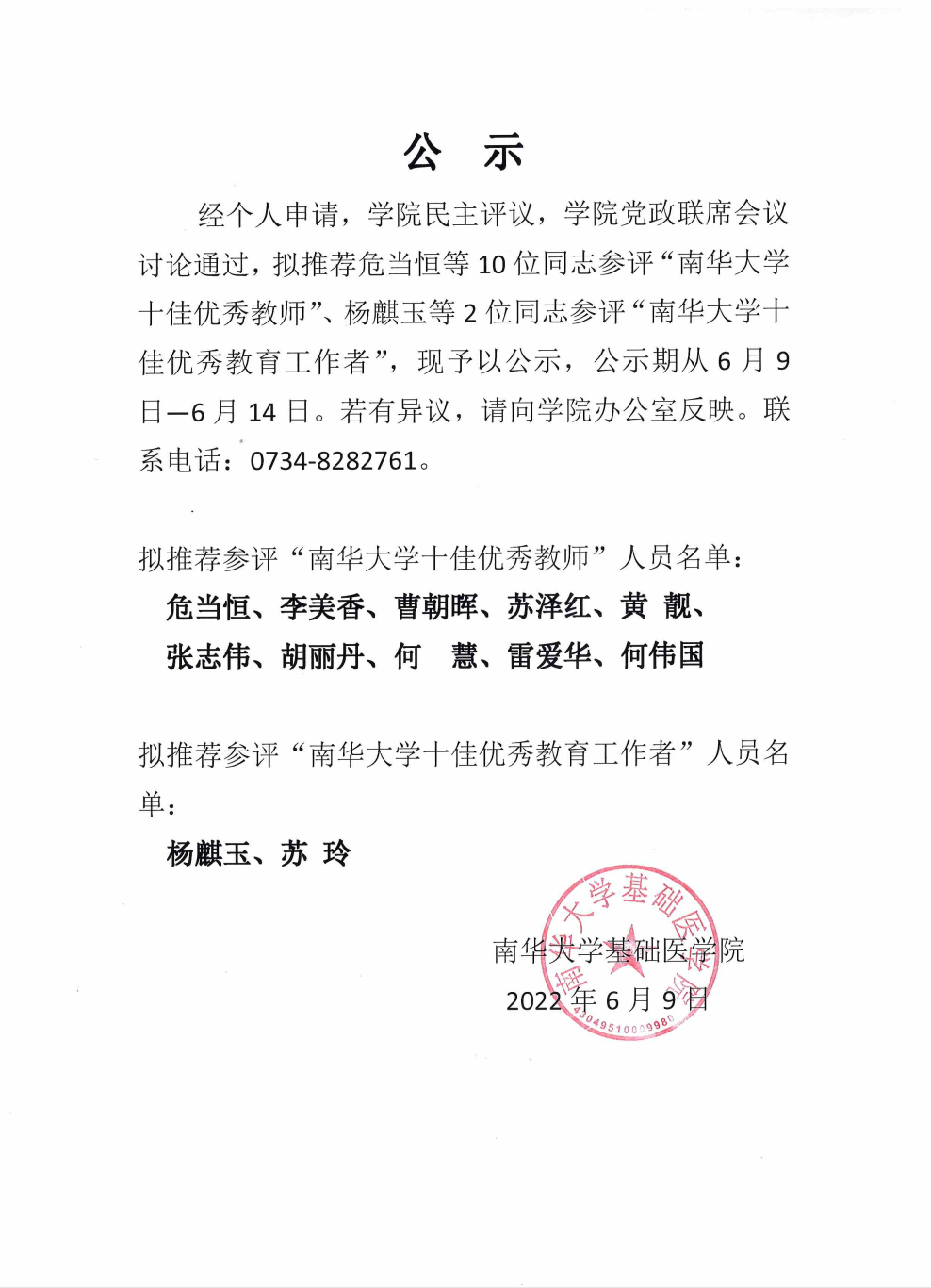 基础医公司关于推荐危当恒、杨麒玉等老师参评太阳成集团tyc33455cc十佳优秀教师、太阳成集团tyc33455cc十佳优秀教育工作者的公示