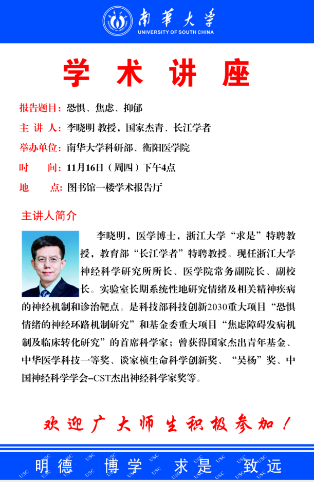 上一条:【义诊预告】11月20日南华附二医院(东院)惠民义诊活动预告 下一条:学术讲座 | 蒋晖博士:Cross-talk between immune system and DNA damage repair system