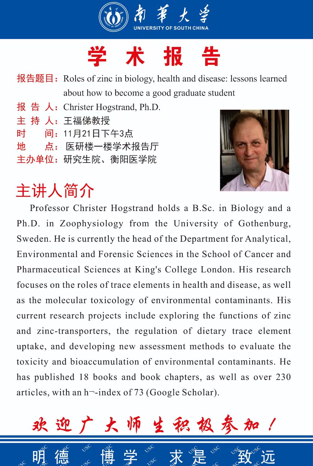 学术讲座 | Christer Hogstrand,Ph.D.:Roles of zinc in biology,health and disease:lessons learned about how to become a good graduate student