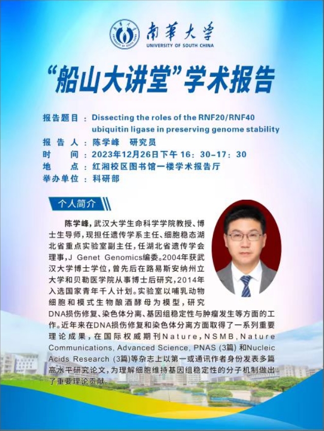 “船山大讲堂”学术报告 | 陈学峰教授:Dissecting the roles of the RNF20/RNF40 ubiquitin ligase in preserving genome stability