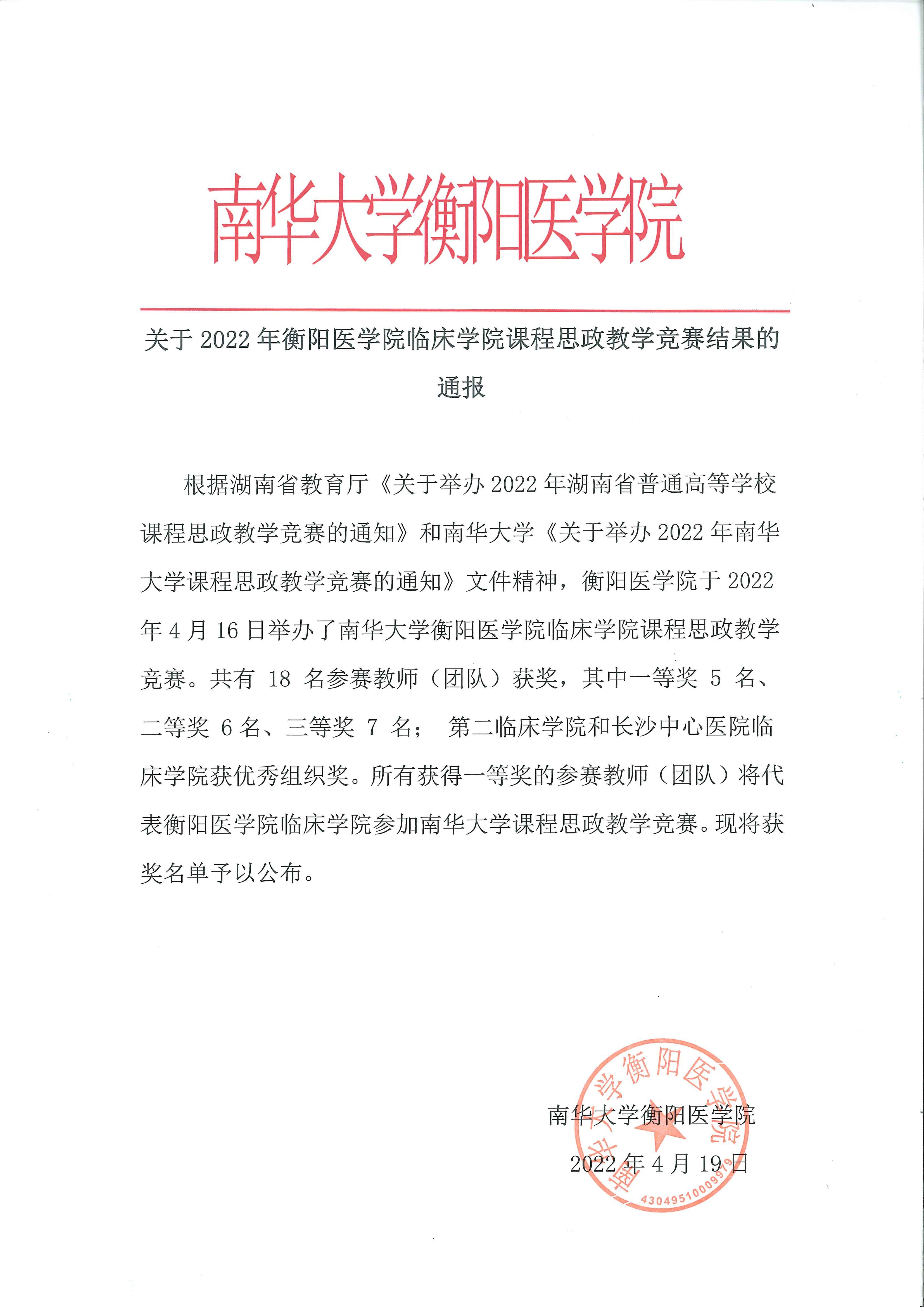 关于2022年太阳成集团tyc33455cc临床公司课程思政教学竞赛结果的通报