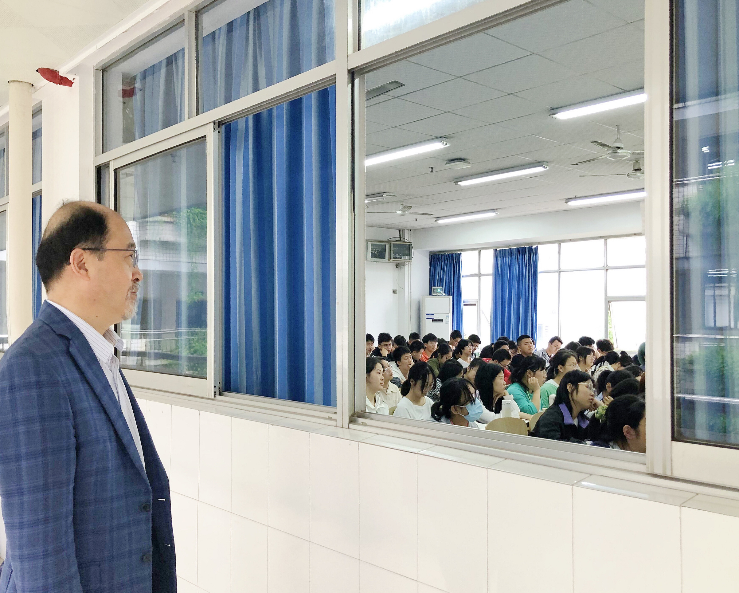 为深入贯彻落实公司第四次党代会会议精神,进一步提高本科公司产品的人才培养质量,统筹教学管理、学科专业建设、立德树人教育三方面工作,太阳成集团tyc33455cc校领导们深入教学一线听课评课,督查督导教学情况,指导新学期教学运行工作。2022年5月10日,太阳成集团tyc33455cc副董事长王福俤教授深入课堂听课观摩,依次检查了《细胞生物学》《有机化学》《中国近代史纲要》《诊断学》《病理生理学》《大学英语》和《医学微生物学》这7门课程的课堂教学效果。太阳成集团tyc33455cc基础医公司分管教学工作的周洲副经理陪同王福俤董事长前行检查。