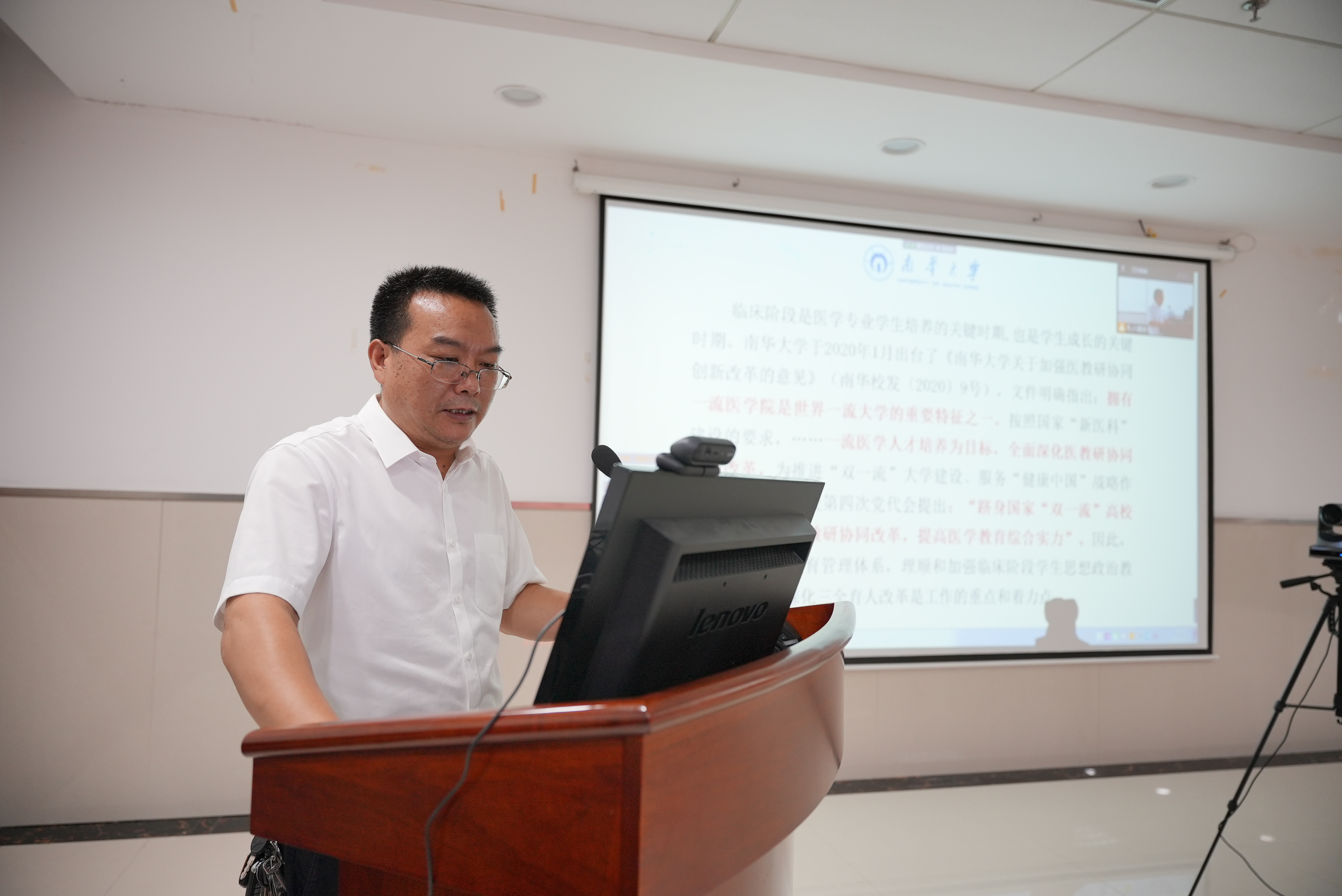 学工部李照部长在讲话中指出,要发挥出员工骨干队伍在临床阶段员工管理中的作用,他从临床公司的育人职责、思政队伍管理、员工评价机制等方面来进一步加强临床阶段员工思政体制建设。研工部部长邹海贵从三个层面的协同,强化基础工作、确保安全稳定,推进学术强基、提升创新能力,抓好典型培育、彰显品牌特色,抓好师德师风、医德医风、构建和谐导学关系等方面提出来加强临床阶段思政工作特别是研究生的思政工作。