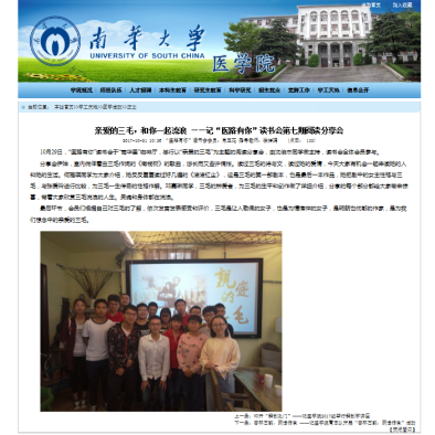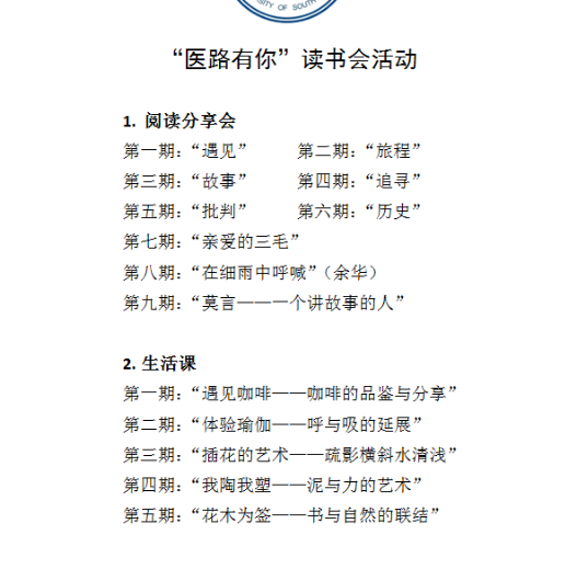 辅导室徐婵娟老师创建“医路有你”读书会和“医路有你”微信公众号,成为校内文化育人品牌。医路有你读书会以“求真、精勤、笃实、明辨”为会训,以种子模式通过线上线下开展经典阅读、文化讲座、读书分享等文化活动。