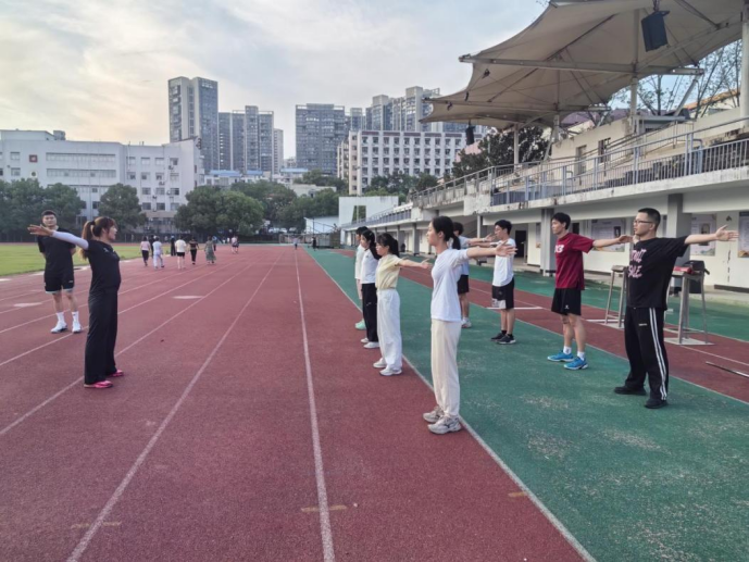 活动伊始,朱清华以丰富多样的运动知识,为同学们带来一堂别开生面的“运动安全课”。他着重强调,充分的准备活动是体能训练的“安全基石”,从动态拉伸到关节活动,每个动作都关乎运动过程中的健康保障。朱老师现场示范了肩部绕环、弓步压腿等标准热身动作,并细致讲解动作要点,让同学们深刻认识到规范热身对预防肌肉拉伤、关节扭伤的重要意义。