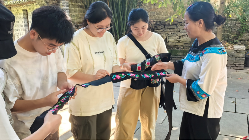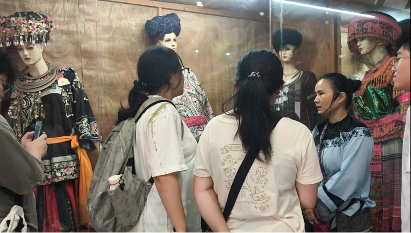 博物馆溯源:触摸苗绣银饰中的文明印记。7月3日,在山江苗族博物馆,队员们通过馆藏实物与传承人专访,系统梳理苗绣纹样的文化密码:蝴蝶纹关联创世传说,江河纹镌刻迁徙记忆,银饰中的图腾符号承载着族群历史。非遗传承人吴利军“纹样是穿在身上的史书”的论断,深刻揭示了“口传心授”传承模式与现代教育体系的衔接困境,为非遗活化提供重要参考。