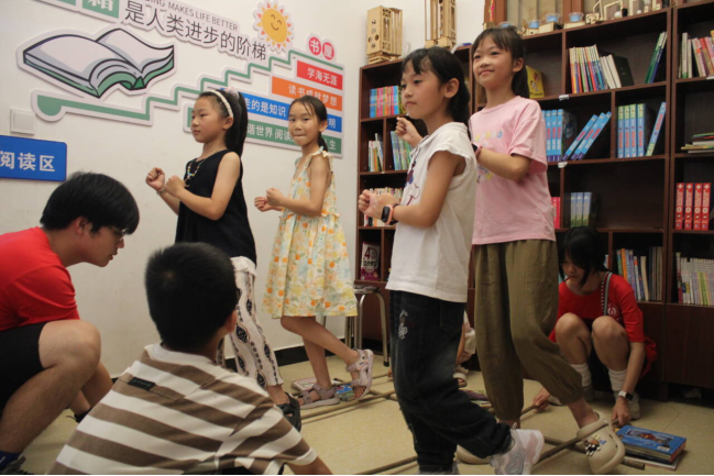 课堂上,志愿者杨芸曦通过生动讲解与易记的节拍口令“开合开合开开合”,引领孩子们触摸畲族舞蹈的独特韵律。伴随着竹竿清脆的敲击声,志愿者们率先示范,脚步轻盈地在开合竹竿间灵巧跳动,瞬间吸引了所有孩子的目光。在耐心的鼓励与陪伴下,孩子们纷纷踏入竹竿方阵。起初步伐稍显生疏,节奏把握不准,动作也略显单一;但随着练习深入,他们的舞姿逐渐流畅,步伐从简单跳跃变得丰富多样,甚至能跟上节奏完成复杂的变换。跳跃间,孩子们欢快的笑声与清脆的竹竿声交织共鸣,不仅亲身体验了传统舞蹈的魅力,更在互动中悄然种下了文化认同与自信的种子。
