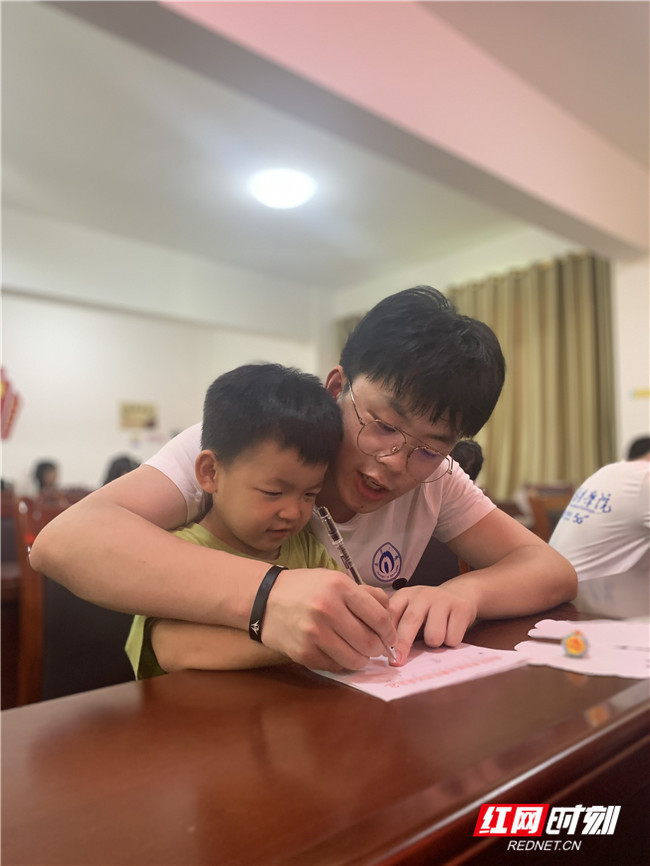服务团成员帮助留守儿童给父母写悄悄话。