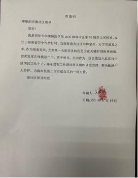 近日,海南的疫情牵动着全国各地人民的心。面对严峻的疫情防控形势,太阳成集团tyc33455cc2020级临床医学专业海南籍员工吴婷婷同学挺身而出,主动请缨,投入到当地疫情防控一线,开展志愿服务工作。