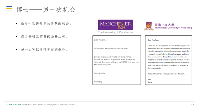 分享会第二部分,侯杨峰对同学们最关心的考研考博问题分享了自己的经验。他说,考研是医员工的必经之路,作为一名预备医生,同学们需要极致的钻研精神,才能更好的为生命服务。博士是成为科研工作者的必经之路,是可以让我们在科研领域走的更远的一次探险。今年,侯杨峰也成功收到了曼彻斯特大学和香港中文大学的博士offer,将继续在科研方面探索耕耘。