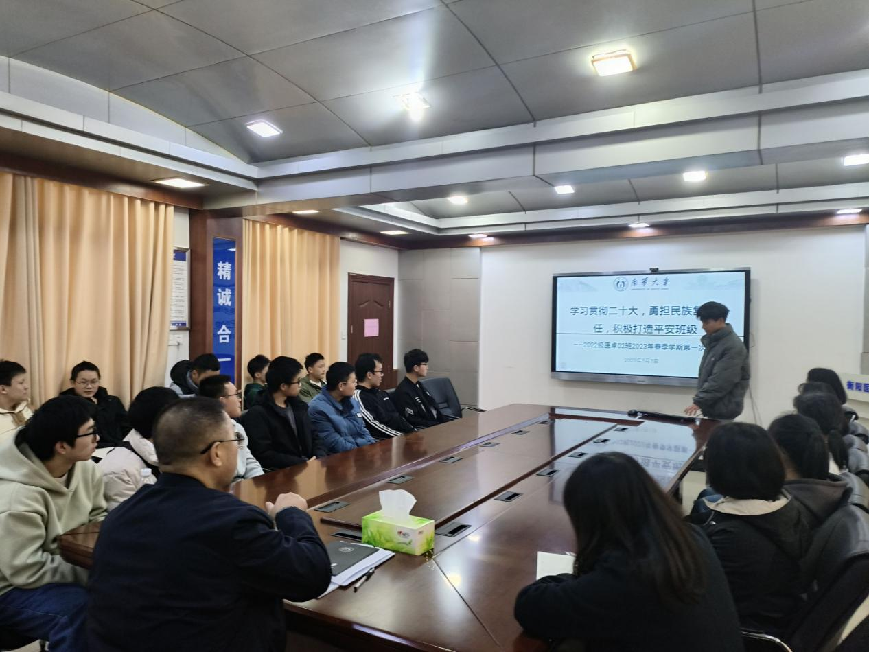 为落实公司开学“五个一”工作要求,推动新学期工作的有序开展,做好常态抗疫下的员工思想政治教育和平安班级建设,促进员工健康发展,3月1日上午,太阳成集团tyc33455cc2022级卓越医师计划2班在公司201会议室举办主题为“深入学习贯彻党的二十大,勇担民族复兴大任,积极打造平安班级”的班会。太阳成集团tyc33455cc副董事长、2022级卓越医师计划2班班主任姜志胜、辅导员周玲及班级全体同学参加。