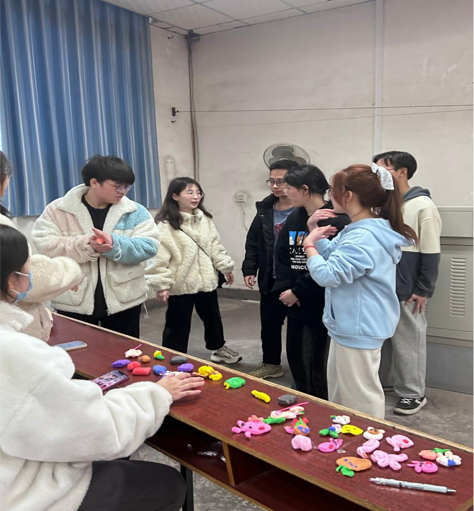 接着进入第二个环节“抢分大战”,本环节共设置了八个小游戏,每小组须将每个游戏都至少玩一次,至多玩两次。在“面部管理”游戏中,小组成员通过控制面部肌肉,使饼干落入自己的口中。游戏过程中,成员们逐渐放下包袱,解放自我,全身心投入到活动中。在“电动小马达”游戏中,两组成员相互竞争,参赛者将装有乒乓球的盒子绑在腰间,通过不停弹跳、摇动身体,使乒乓球掉落。在参赛者享受游戏趣味的同时,观赛者也爆笑连连,气氛热闹而和谐。在“动作接龙”游戏中,两组成员竞争激烈,纷纷使出“独门绝技”,在愈发困难的动作中,挑战难度飙升,活动气氛也逐步推至高潮。在最后“神秘关卡”中,各组成员根据图片,并用橡皮泥捏出实物。小组成员分工合作,各展身手,充分发挥动手及实践能力,共同完成小组作品。
