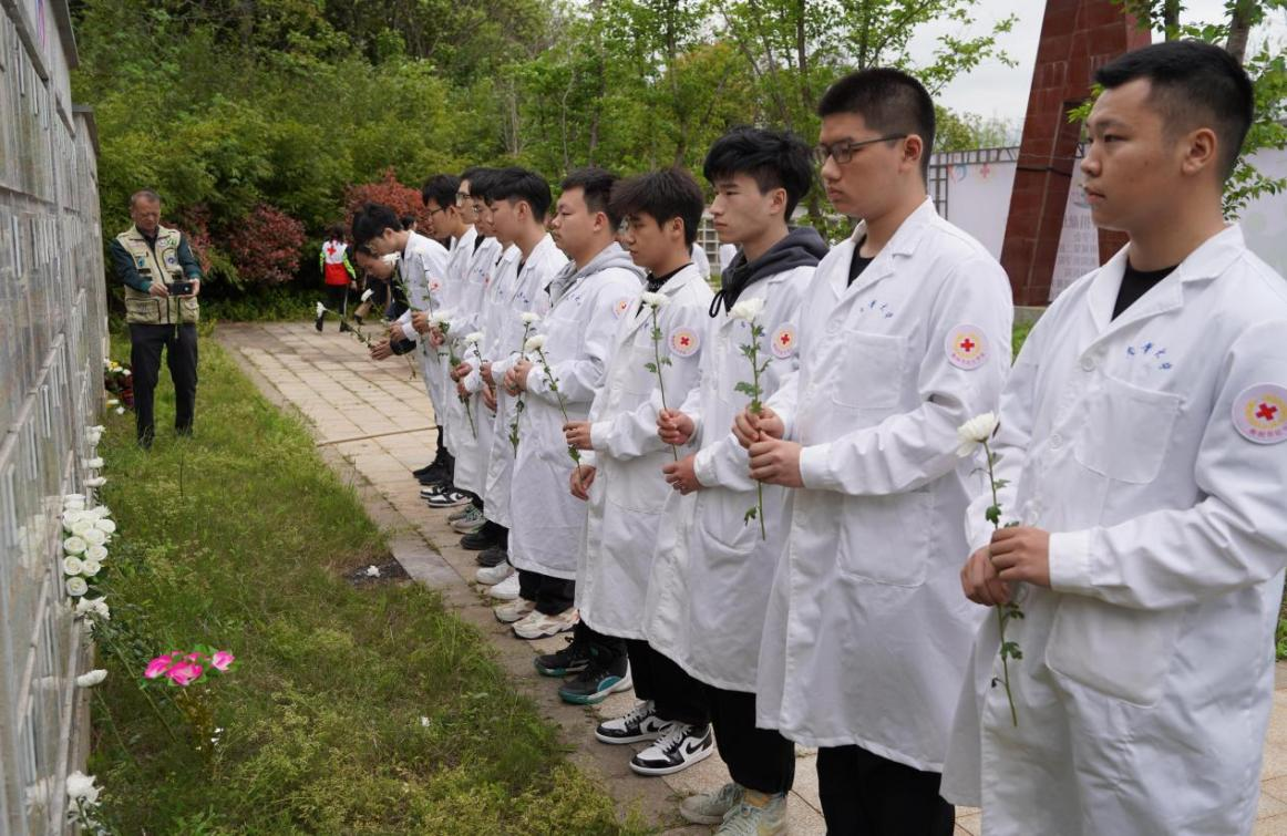 最后,公司师生身着白大褂,手握白菊,整齐站在记录着器官捐献者姓名和照片的墓碑前,怀着崇敬的心情鞠躬、献花,表达对捐献者的哀思和敬意。