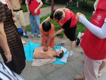 活动中实践团成员彭钰婷为广场群众进行了有关心肺复苏的演练,并向群众科普心肺复苏知识,细心讲解抢救过程中需要注意的事项,并强调了动作规范的重要性,只有有效且正确的按压才能更好地为病人提供帮助,为救护的到来提供宝贵时间。