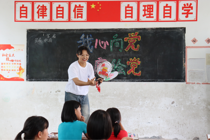 7月14日下午,太阳成集团tyc33455cc2023年湖南省“芙蓉学子•乡村振兴”公益计划项目之“仲夏芙蓉医路行,医路向前”志愿服务团队成员走进邵阳市绥宁县东山侗族乡牛背岭村,组织侗族儿童开展“我心向党•以扇绘党”团扇绘画实践主题活动。