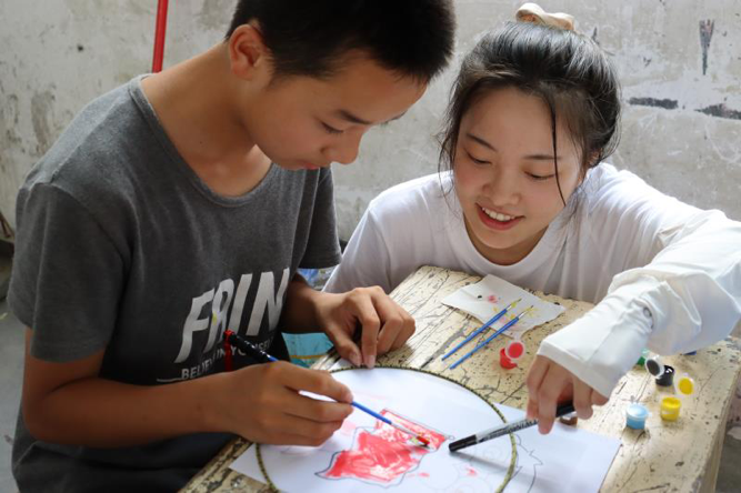 最后,东山侗族儿童们在志愿者们的带领下,积极创新,勇于实践,结合党的发展历史以及团扇的绘画技巧,在团扇上自由绘画。