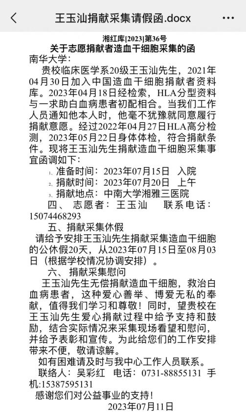 7月20日,王玉汕同学将在长沙湘雅三医院捐献造血干细胞,让我们祝愿手术一切顺利,也祝愿患者早日康复!