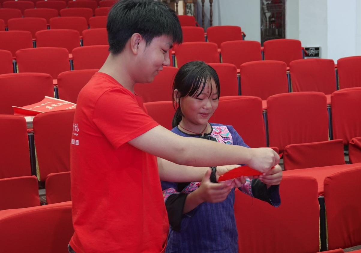 活动现场,宣讲员为十八洞村的孩子们详细介绍了剪纸文化的历史、用途、形式以及分类,帮助孩子们感受剪纸艺术所承载的历史韵味与文化内涵。随后,团体成员们细致地教授大家剪纸的基本技巧,并教授大家如何折叠、如何裁剪。活动吸引了许多外地游客,他们纷纷带着孩子加入。队员们带领孩子们一起动手,体验了剪纸艺术的魅力,同时还感受了底蕴深厚的非遗文化。剪刀飞舞,纸屑纷飞,谈笑间一幅幅活灵活现的剪纸图案便呈现在指尖,活动现场充满笑声。